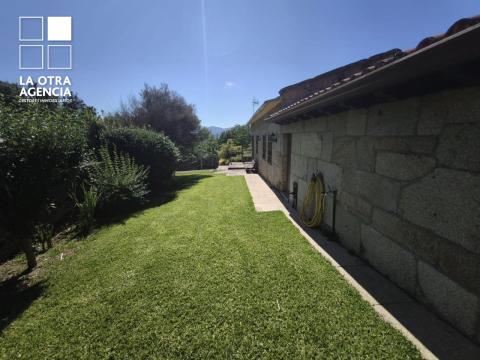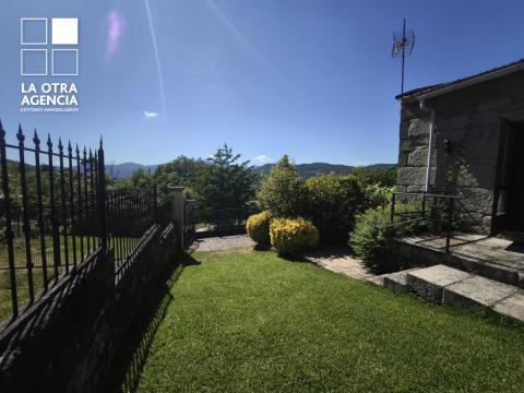 Toda la vivienda se desarrolla en planta baja, rodeada de un generoso jardín que recorre el perímetro y realza la belleza de la piedra. El salón, de 30 m², inunda el espacio de luz natural y brinda panorámicas espectaculares sobre el valle, mientras el sistema de calefacción por pellets garantiza un ambiente cálido y acogedor en cualquier estación.
